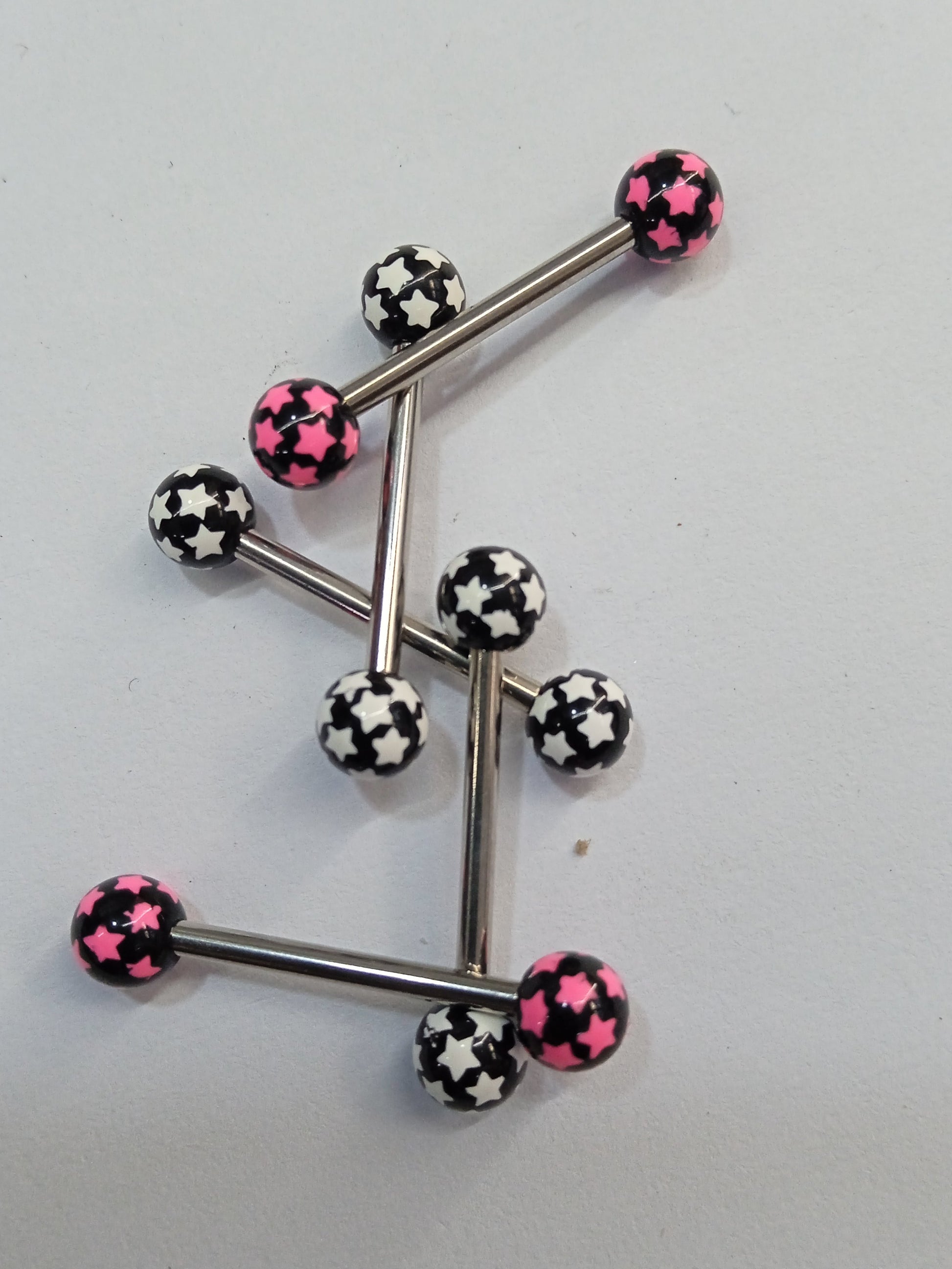 Piercing de lingua com bolas de acrílico motivo estrelas.
