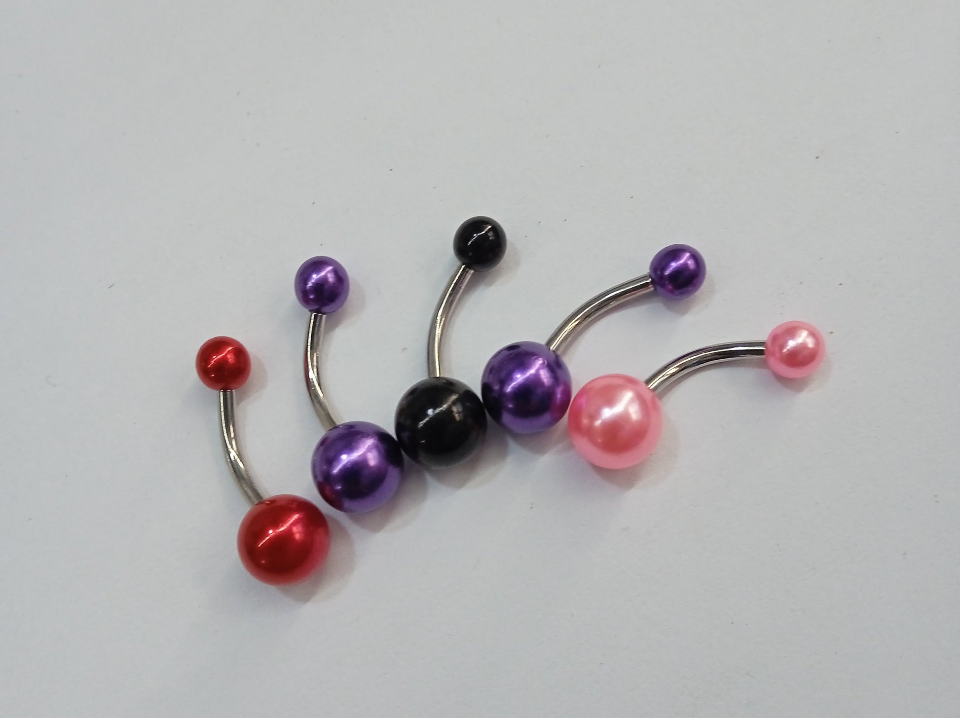Piercing de umbigo com bolas de acrílico efeito pérola.